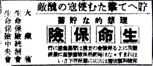 「貯えて撃たむ侵寇の醜敵 理想的な貯蓄 生命保険 戦災による保険金の支払は簡易急速に行われます。なお、時節柄保険証券並に最終保険料領収書は大切に御保存下さい 大蔵省 生命保険統制会 生命保険中央会」