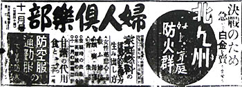 「戦局重大 婦人総蹶起!! 生活の決戦化!! 慰問用箋 前線慰問用箋を□へました。ゼヒご利用下さい! 前線へ雑誌を送りましょう 〜 肺病征服講座、健康育児講座〜 節米栄養丼の工夫、決戦料理の基礎〜 防空服の防寒工夫、更生洋裁独習講座〜 空襲時の衣類〜 」