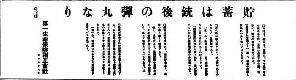 本社の昨年度業績は 幸い江湖各位の御賛同を得て、保有契約高は五十億余万円に、保有資産は七億五千万円に達し、一は戦時下国民生活安定の防塞とし、一は公債消化、生産力拡充の資金として、それぞれその役割をはたしつつあります。