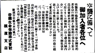 保険会社の広告といっても、戦争遺跡の観点から、戦争遂行に関わる商品や戦意高揚など国策に沿った内容のものなど、戦争をイメージさせる広告を紹介する。 特に、現在は存在しないが「徴兵保険」という商品が存在し人気であった。