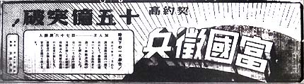 常連。富国徴兵の広告。毎回、噴辞職の強いイラストで戦費調達をアピールしている。今回は、日章旗を掲げて突進する兵士の姿である。