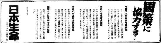 時局下の生命保険事業は ただに御加入者各位の生活保全のためのみならず、高度国防国家体制完成への途上、最も必要な国民貯蓄運動の強力なる一翼として、大東亜協栄圏の確立に至大の貢献をなしつつあります。