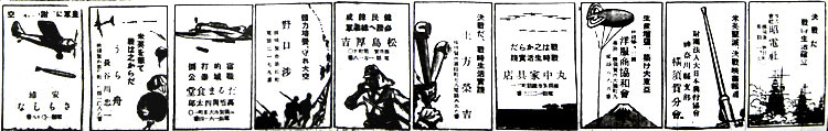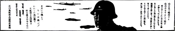 「敵米国はあがく 皇土の空を窺ふてあがく 鉄壁の防衛陣も 戦線補給の船団護衛も 飛行機だ!飛行機だ! 断じて我等の手で 引きうけよう!! 神奈川県下 日本精工株式会社」