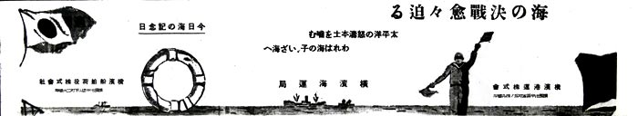 「決戦だ! 増産だ! 撃滅だ! 今日も又一艦 敵撃滅の太平洋へ! 一億戦闘配置へ 今こそ舟艇を造れ!! 明日の十隻より今急ぐの一隻が重大戦局を左右するのだ 烈々たる大和魂を我ら産業陣も伝承して 必勝撃滅増産に敢闘せん、これが我らの責務だ