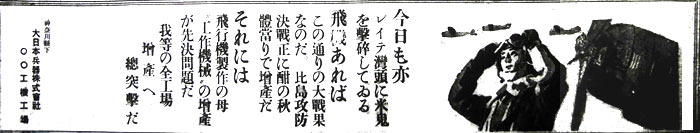 同じテンプレートを使った石川島航空の今月2回目の広告で、文章は替えてきている。増産、増産の意気込みで機械力を誇るアメリカに打ち勝とう呼びかけている。勿論、精神論だけでは勝つ事はできないのだが、こう訴えるしかないのである。