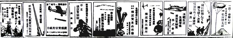 「二百七十億貯蓄総進軍 横須賀市銀行組合一同 決戦だ!米英撃滅総進軍 横須賀市会議員一同 糧食確保大進軍 横須賀海軍糧食商組合 貯蓄目標達成 神奈川県洋紙商業組合員 神奈川県和紙商業組合員 株式会社村松商店 日本印刷文化協会々員 横須賀市官納商業組合員 村松印刷株式会社 横須賀市大瀧町 米英撃滅決戦生活確立 実用雑貨配給店 株式会社さいか屋 横須賀市東郷通り 電話〜 米英必滅 輸送に邁進 相模運輸株式会社 横須賀市若松町九二 電話〜 生産増強・商業報国 横須賀商工会議所」