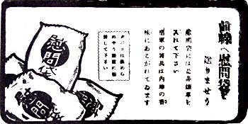 慰問袋には是非煙草を入れて下さい 皇軍の将兵は内地の香味にあこがれています タバコは湿らぬよう厳重に包装してください」