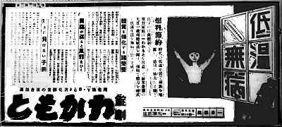 錠剤わかもとは、現在は「強力わかもと」という名称で販売されている。そのコピーは、「消化酵素、乳酸菌、ビール酵母の3つの天然成分が、胃もたれ、便秘、滋養強壮に効く。」であるので、当時の広告は誇大ともとれる内容だが、それも時代なのであろう。