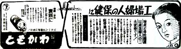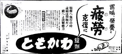 産業戦士向けの広告で、増産のために役立つことを前面に訴えるいつもの内容である。疲労回復や筋力増強に加え、神経敏活にも効能があるとは、なんでもありの勢いである。