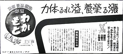 全力を振って大東亜戦を戦い抜く爲に、病弱者は錠剤わかもとで体栄養を充実し増産体力確立へ! 結核の治癒力を増強 食欲不振、倦怠感微熱、盗汗等の身体違和は結核潜在の徴候ですから〜 細胞賦活作用 筋骨薄弱で体力に乏しく、仕事にすぐ疲労を覚える虚弱者は錠剤わかもとを常用して体質を強化し〜」