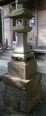 日露戦争における氏子出征軍人の凱旋を紀念して奉献された燈篭。従って、明治40年前後の建立と推測される。