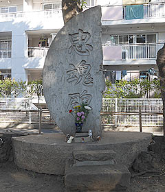 この一風変わった形状の石碑は、黒色火薬製造に使われた圧磨機の圧輪の石を割って使用したもの。残りの半分は台石に使われている。この辺りは陸軍造兵廠滝野川工場(通称雷汞場)があり、工場での爆発事故の殉職者の慰霊碑であろう。割れたのも爆発事故によるものかもしれない。実際、明治43年10月27日に火具製造所構内で大爆発事故が起こっている。