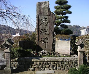 この碑は元々、愛宕園(愛宕山公園)に日清戦争の戦病死者の忠魂のために明治30年3月に建立されたものである。 関東大震災により碑は倒壊したが、昭和初期(御大典記念として昭和3,4年頃と推測)に高坂小学校校庭に移された。 戦後の混乱で引き倒され放置されていたのを、昭和24年3月に井上亀之助が小学校裏山に立て直したが、その際、碑の両側に昭和になってからの戦没者も併せ慰霊するために昭和事変英霊の碑を建立した。その後、昭和38年10月15日に、現在地に移された。建立当初に合わせ建てられていた建設発起人の碑は、現在は忠魂碑の裏にある。 なお、忠魂碑左手には、碑の再建に尽力した井上亀之助顕彰の碑が建てられている。 所在:東林寺(横須賀市) <忠魂碑> 碑高352cm、幅120cm、厚さ20cm、基壇64cm (刻字) 碑正面:「忠魂碑 陸軍大将正二位勲一等功二級侯爵 大山巌書」 <建設発起人碑> 碑高156cm、幅107cm、厚さ13cm (刻字) 碑正面: 「忠魂碑建設發起人 臼井儀兵衛 宮井清左衛門 太田又四郎 宮井與右衛門 三次六兵衛 増田太兵衛 加藤小兵衛 臼井辰右衛門 栗生太四郎 穴澤與十郎 委員 長島忠左衛門 鹿目常吉 上坂伊之助 加渡田忠兵衛 平野吉兵衛 橋本益太郎 赤井久兵衛 明治三十年三月竣工」 <昭和事変慰霊の碑(一対)> (刻字) 碑正面:「昭和事變英霊(戰病没者英霊名)」 碑裏面:「昭和貳拾四年参月吉日」 <灯篭(一対)> 全高166cm (刻字)「御大典記念 浦賀町老兵會」 |