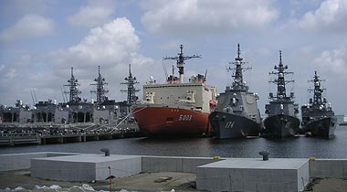 左手にはおなじみ海上自衛隊艦船の姿が。