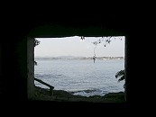 写真左手のこんもり茂った木々に隠れるように、岩崖に幾つも洞窟が掘られ、湾口部には基地を守るための洞窟砲台が築かれている。