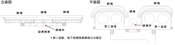 中央横墻下部には地下砲側弾薬庫が設けられ砲座面の位置に揚弾井が開口している。中央横墻下部の弾薬庫を含む構造物はフランス積みのレンガ造である。