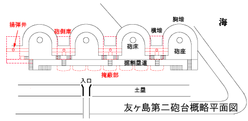 友ヶ島第一砲台の北側約50m離れた海岸低地に建設された砲台。目的は第一砲台同様「由良海峡を射撃し以て同海峡に於ける敵艦の通過を防遏(防止)する」である。